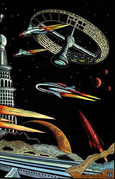 La série ASTRO est un hommage aux magazines de bande dessinée de science-fiction pour la jeunesse des années 50/60 : MÉTÉOR, SPOUTNIK, SIDÉRAL, ATOME KID, MONDE FUTUR, COSMOS...La série est entièrement réalisée en lino-gravure sous forme d'un travelling constitué de 24 gravures mesurant chacune 70 cm x 46 cm.